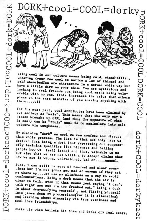 There is no trace of a BK tune by that name. However, the legendary Bikini Kill #2 ’zine from 1991—famous for the first use of the phrase ‘girl power’—also featured some deep thoughts on dorky cool. A Riot Grrrl manifesto flyer created by Kathleen Hanna also urged us to embrace our inner dork.
